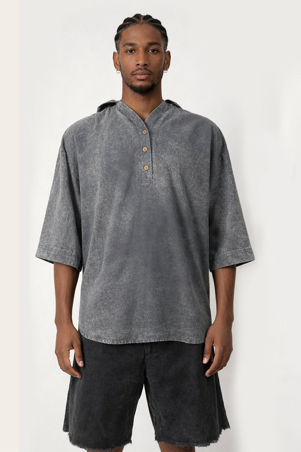 The neckline is a soft split V with a short Henley-style placket, detailed by three small, round wooden buttons that add an organic, handcrafted feel. The collar is minimal and collarless, keeping the look understated and rustic.