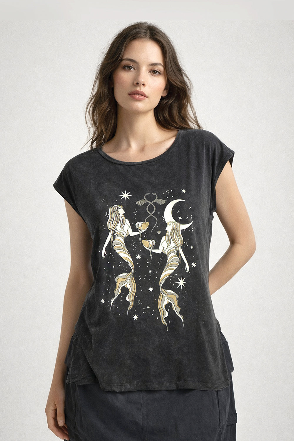charcoal black casual tees with a soft, slightly washed fabric texture and relaxed silhouette. The top features a wide round neckline and short cap sleeves, giving it an effortless, laid-back feel.
