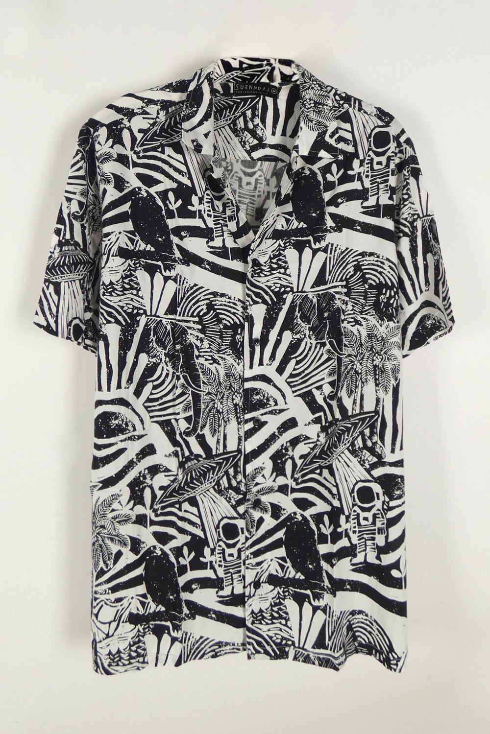 Make a bold statement with this eye-catching black and white rayon shirt, designed for comfort and style. Featuring a surreal, cosmic jungle print, this short-sleeve button-up shirt is adorned with vivid illustrations including astronauts, UFOs, palm trees, and oversized mushrooms, all intertwined in a mesmerizing, psychedelic landscape. The soft and breathable rayon fabric drapes effortlessly for a relaxed fit, perfect for casual outings or standout festival looks. Whether you're channeling vintage vibes or just love a unique conversation starter, this shirt is your ticket to intergalactic cool