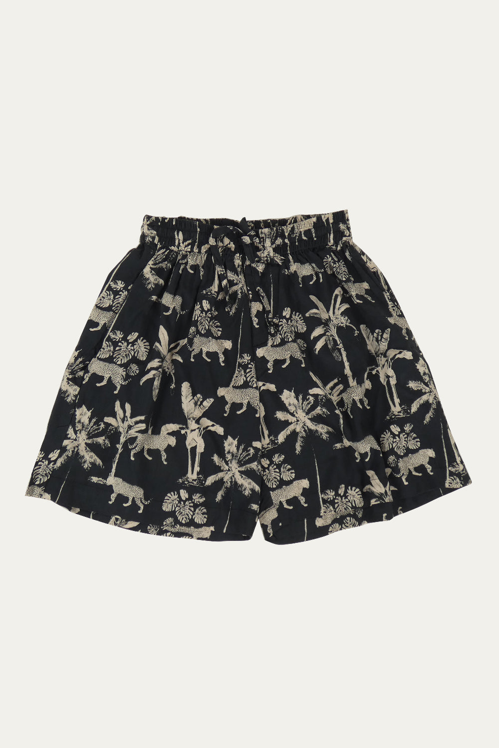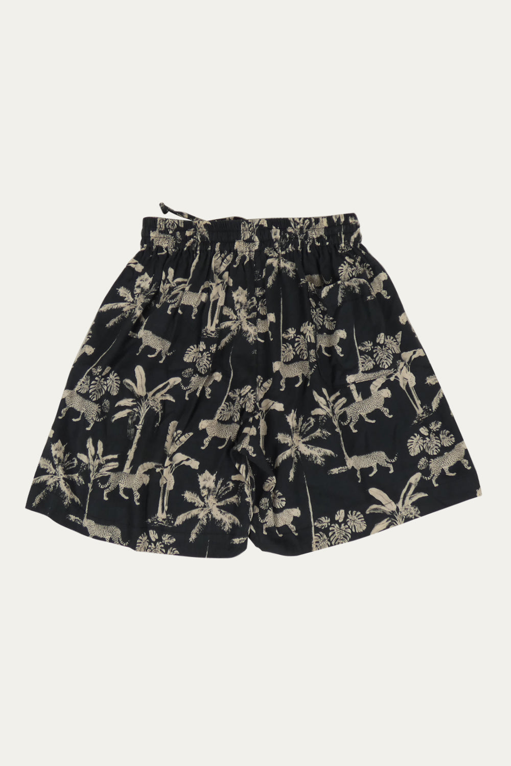 This is a pair of casual men's shorts made from 100% viscose, offering a soft and comfortable feel that's ideal for warm weather. The design features an elastic waistband with a drawstring for adjustable fit and ease of wear. The fabric showcases a vintage-style all-over print composed of tropical and leopard, in a muted green and beige color palette. The shorts include a convenient back pocket, adding both practicality and laid-back style.
